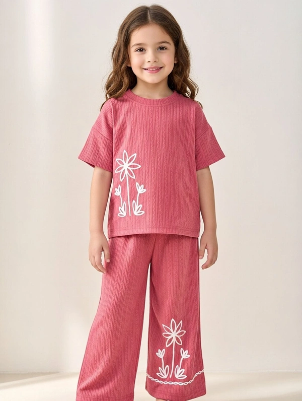 Girls Coral Pink Floral Embroidered Co-Ord Set | Soft Ribbed 2 Piece Top & Wide Leg Pants Outfit