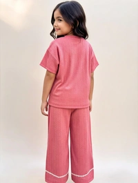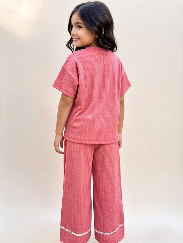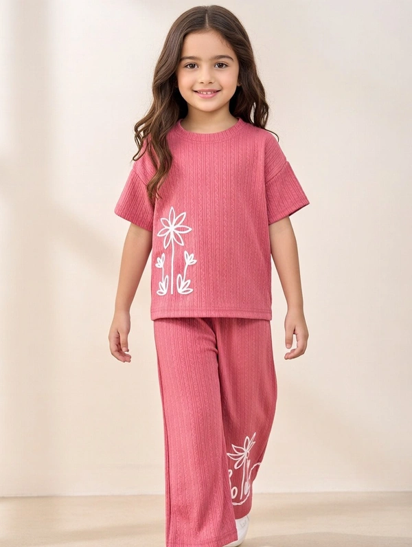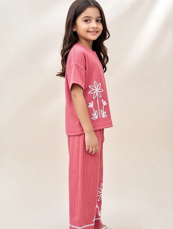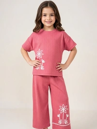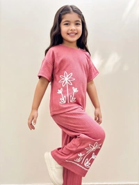 Search Tags: girls co ord set pink, coral pink co-ord set for girls, embroidered 2 piece outfit kids, floral co ord set 4-6 years, ribbed kids summer set.