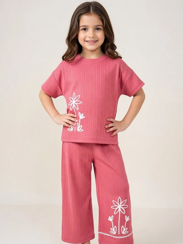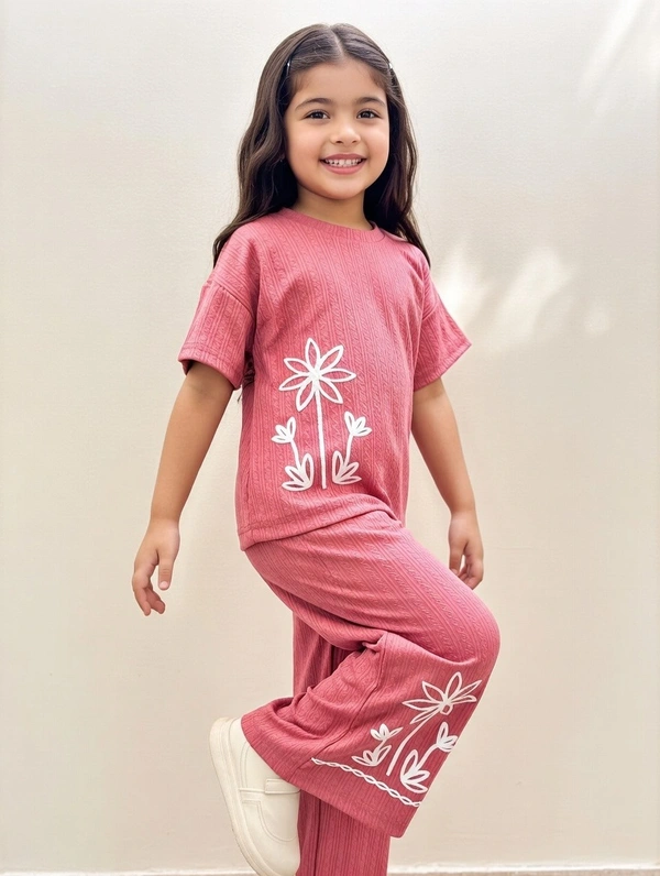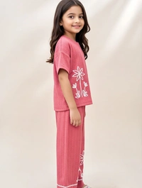 Search Tags: girls co ord set pink, coral pink co-ord set for girls, embroidered 2 piece outfit kids, floral co ord set 4-6 years, ribbed kids summer set.