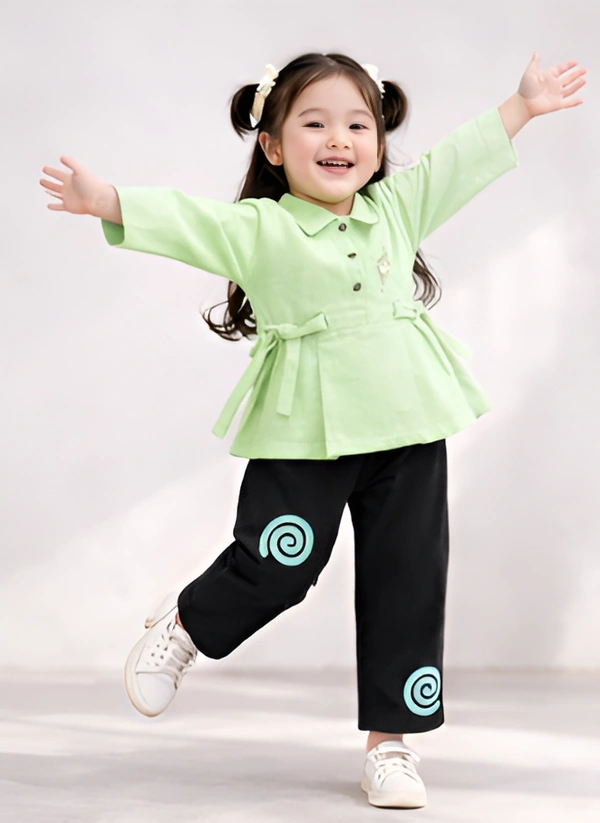 Light Green Girls Co-Ord Set | Cotton Top with Black Cotrise Corduroy Pants | Spiral Design | Kids Ethnic Casual Outfit Set
