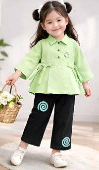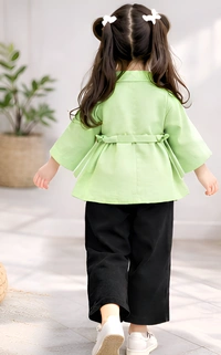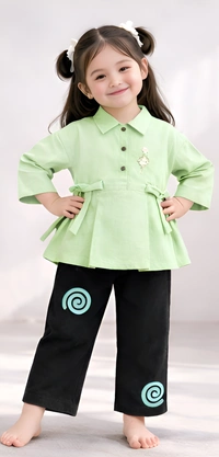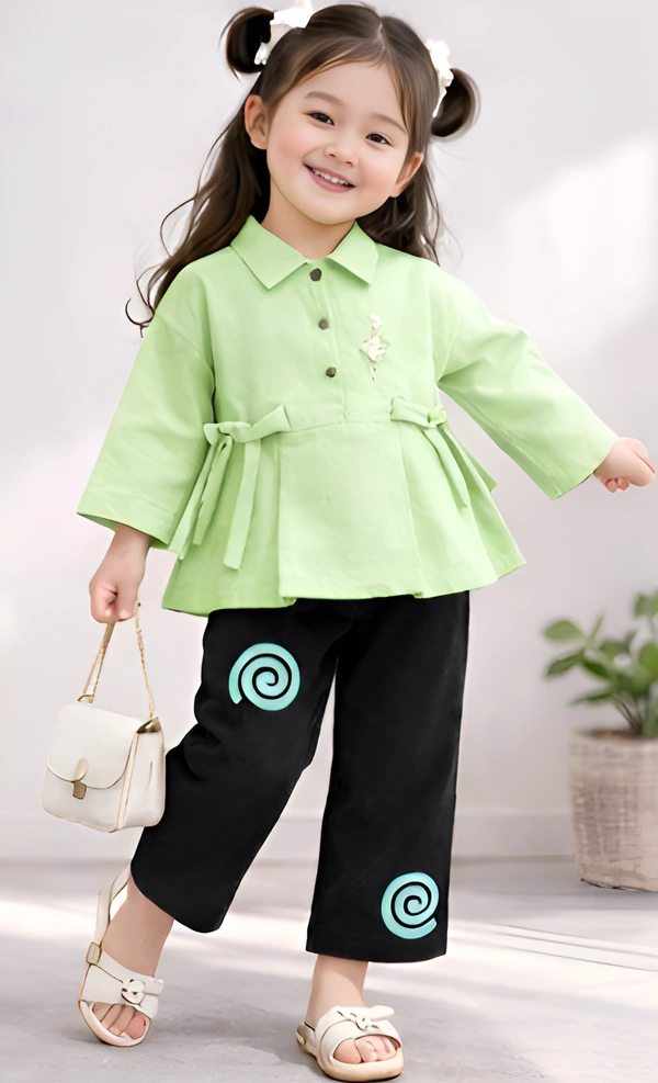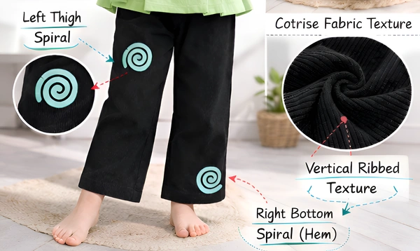 Upgrade your little girl’s wardrobe with this premium light green co-ord set featuring a soft cotton top paired with stylish black cotrise (corduroy) pants. Designed with beautiful spiral embroidery on the left thigh and right bottom hem, this outfit combines comfort and trendy fashion. The pants showcase a clear vertical ribbed corduroy texture for a premium look and feel. Perfect for casual outings, festive wear, photoshoots, and special occasions.