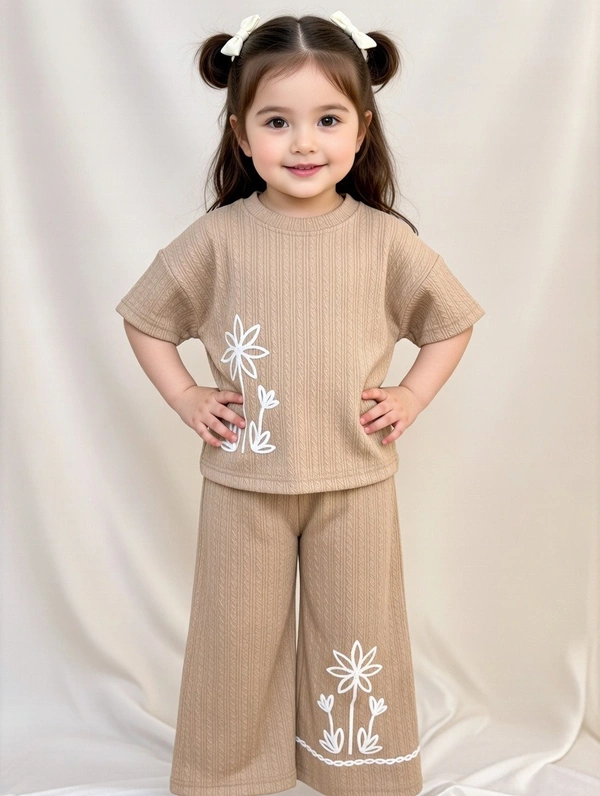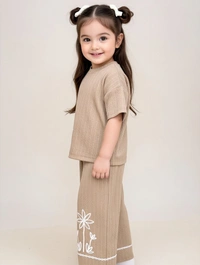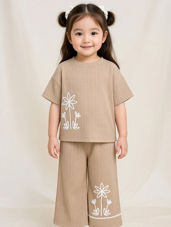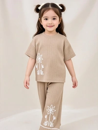 ✨ Why Parents & Kids Love This Set: • Ultra-soft ribbed knit fabric — breathable, stretchy & wrinkle-resistant • Beautiful hand-look white floral embroidery on top & pants • Easy matching 2-piece design for instant cute outfits • Wide-leg pants with comfy elastic waist and chain hem detail • Short sleeves — ideal for spring, summer, or layered looks • Neutral beige pairs perfectly with sneakers, sandals, or bows